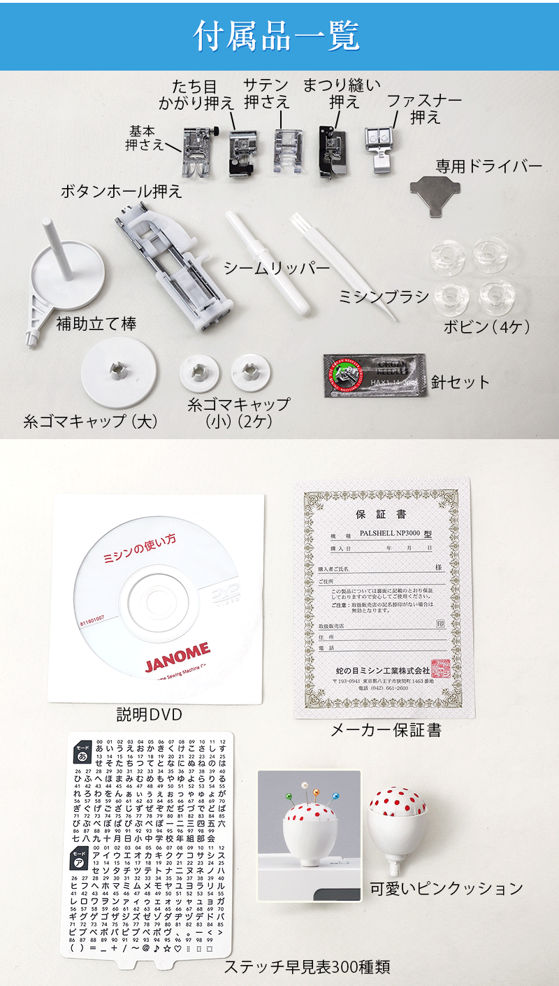 ワイドテーブル、フットコントローラー、コードリール、基本押さえ、たち目かがり押さえ、ファスナー押さえ、サテン押さえ、まつりぬい押さえ、ボタンホール押さえ、糸こま押さえ(大・小 各2個)、補助糸立て棒、ボビン4個、針、シームリッパー、ミシンブラシ、ドライバー、オリジナルピンクッション、説明DVD、取扱い説明書