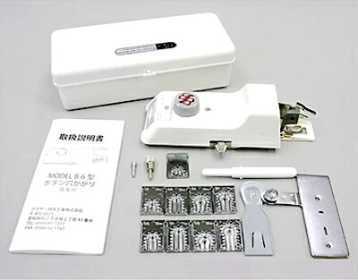 MODEL B-6型のボタン穴かがり器、ネムリ穴のコマ(13mm、16mm、18mm、21mm)、ハトメ穴のコマ(16mm、18mm、21mm、24mm)がセットになっています。