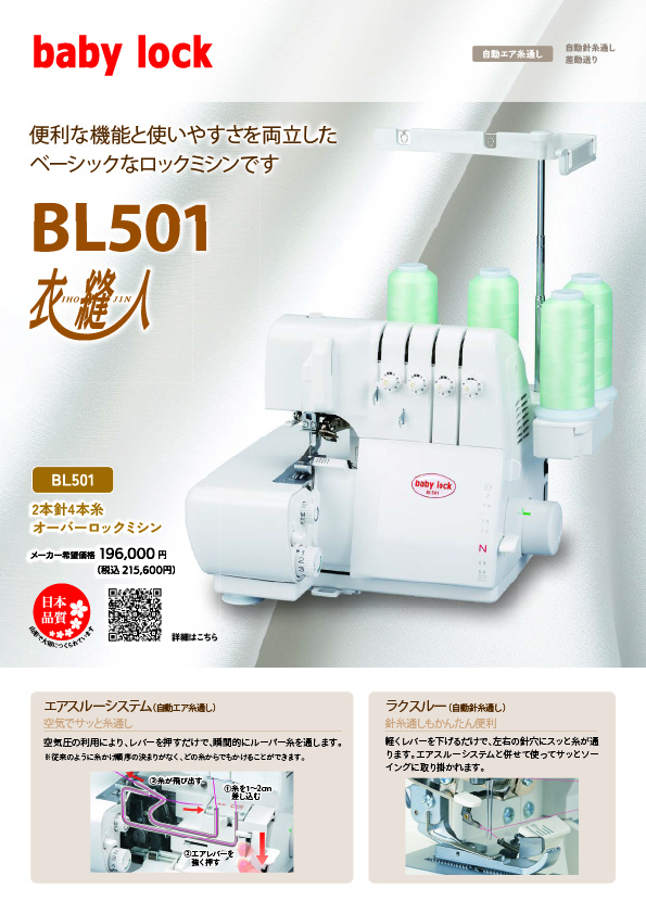 衣縫人 BL501は、ロックミシンで、世界的に圧倒的なシェアを誇るベビーロックのメイド イン ジャパン機種となります。 耐久性、操作性、仕上がり等、大変に優れたロックミシンです。