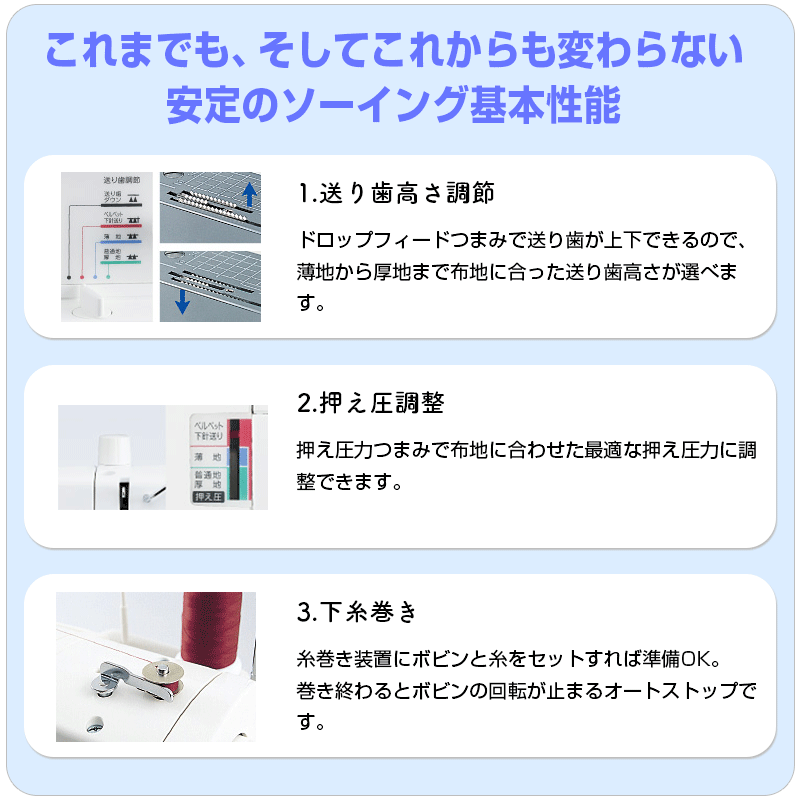 糸切り機能なし・針糸通し機能なし・下糸クイックなし