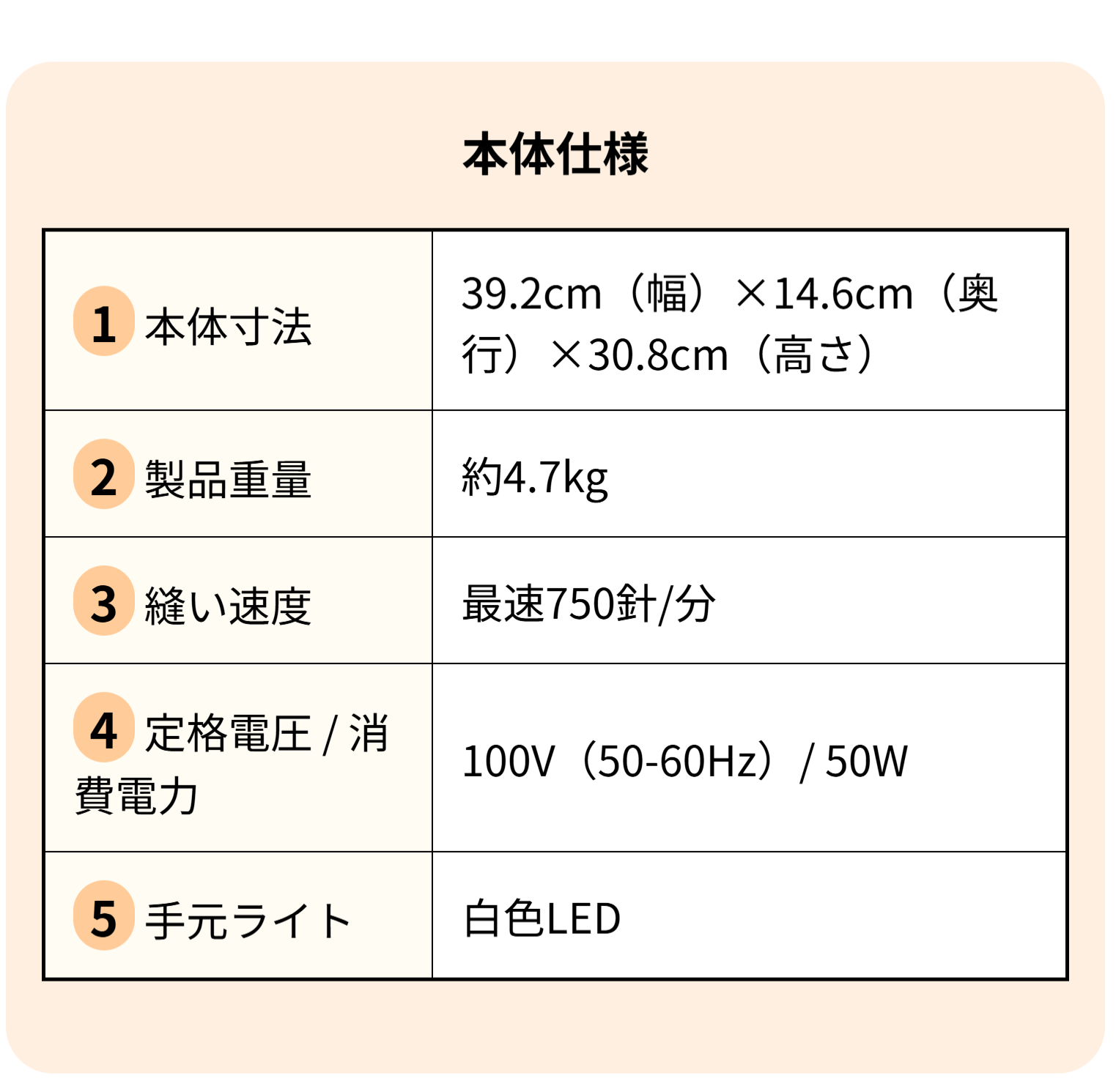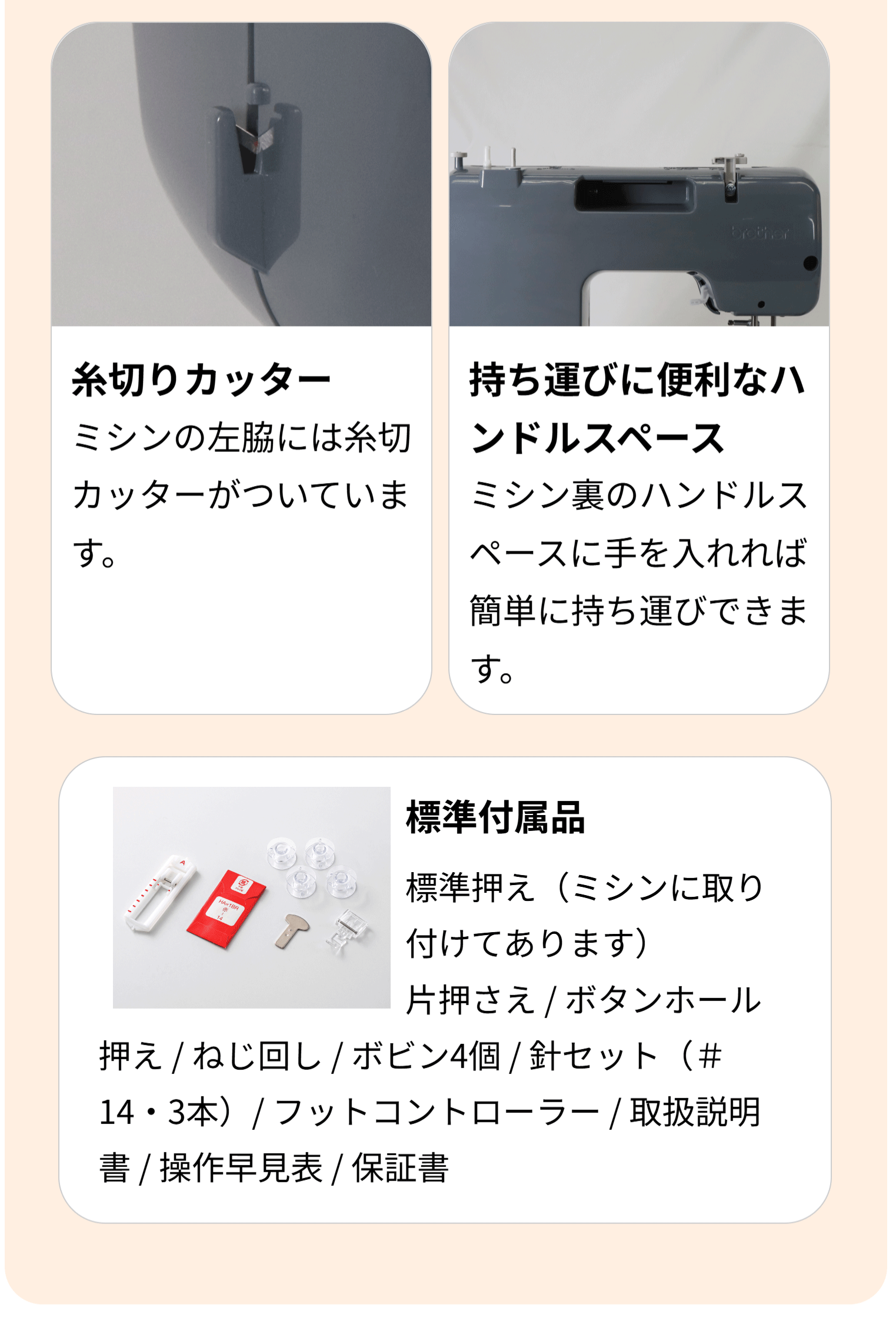 片押さえ / ボタンホール押え / ねじ回し / ボビン4個 / 針セット(#14・3本)/ フットコントローラー / 取扱説明書 / 操作早見表 / 保証書